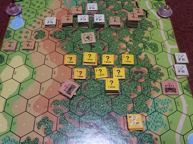 オーストラリアは6.5ターン以内に、尾根(R3とR6の間)から、10VP以上突破したら勝利です。浅いジャングルの太平洋地形で、レベル4のジャングルはクナイに置き換わります。また南から風が吹いています。