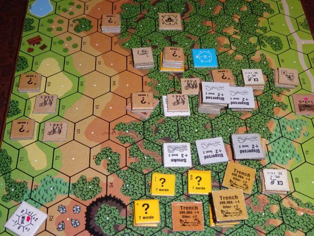 第2ターン、日本の右トーチカが無力化したので、オーストラリアはそちらへさらに1スタックを送って、後方攻撃を強化します。そして残りの主力は、中央で複雑な攻防戦。日本も取捨選択しながら、難しい防御射撃をしますが、最終的にオーストラリアは同数の無事な部隊が隣接に成功しました。ANZACも隠密なので、場所を選んで2対1の白兵戦を掛けられたら厳しいと考え、日本の前線に並ぶ半個分隊は自己混乱で逃げ、ほぼ自動成功の回復をすることにします。