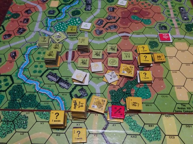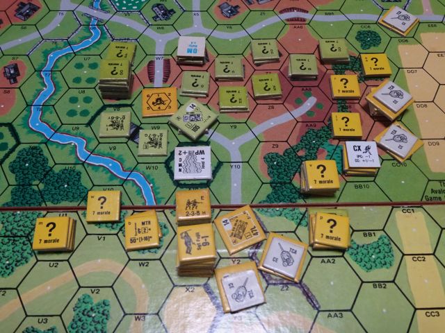 左右の建物も気になる所ですが、やはり基本は戦力集中で、アメリカは中央前面の建物群に、ほとんどの戦力で布陣します。そして日本はこれをどう攻めるか。アメリカは建物群正面にずらりと兵を並べており、正面攻撃だけでこれを破るのは無理でしょう。かと言って涸れ谷の東側は、東側中ほどに控えるアメリカの大スタックが、多分32火力−1修正で狙っていると思われるので、最初からここを進むのも自殺行為でしょう。うーん、これは難しい。