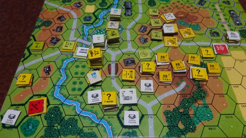 ところが東側でさらに建物2つを取りに行くはずだった減少分隊が、狙撃兵でピン。さらに主砲が故障して生け垣に隠れていたチハが、4ヘクス先からバズーカを当てられ撃破されてしまいました。がーん。