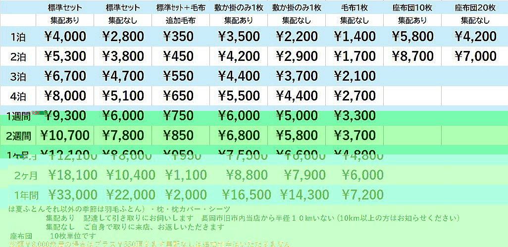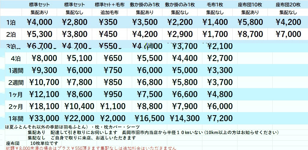 お電話での問い合わせ・ご注文は0258-33-7151 メールでの 問い合わせ・ご注文は e-futon@nct9.ne.jp 2026年貸ふとん料金