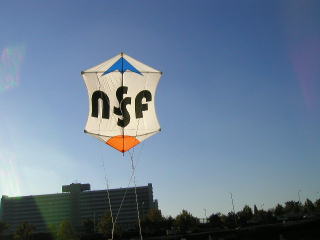 ←朝日の中、外国の空に自作の凧が吸い込まれて行くのは感動です。建物の手前は先程のバイパス、落ちたらマズイよ。