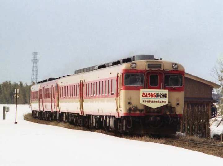 東赤谷に停車中のさよなら列車、赤谷線のさよなら列車は3月下旬に定期列車とは別に2往復が運転されました。