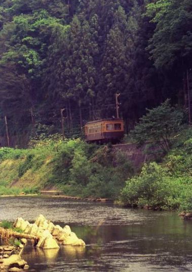 狭口〜七谷間、加茂川に沿って走るモハ31、山深い雰囲気もしますが対岸には県道が走っており撮影しやすいポイントでした。