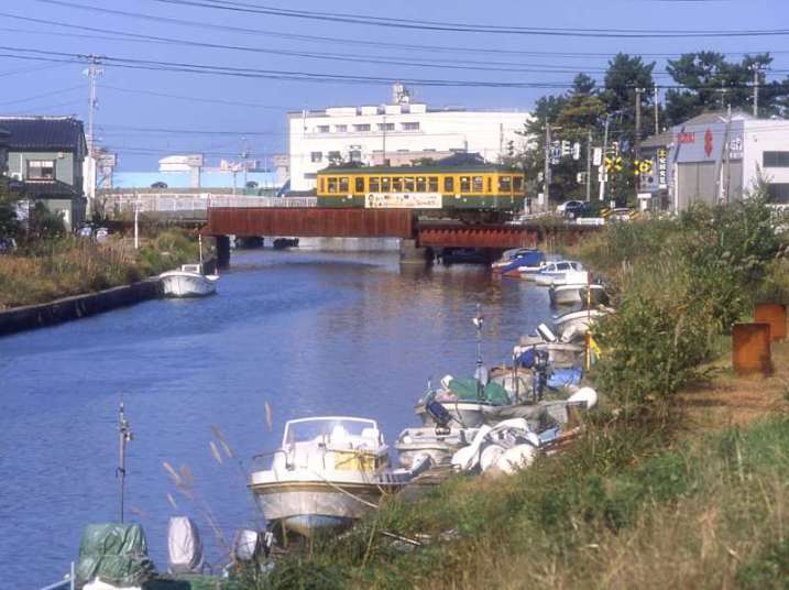 平島にて、西川の鉄橋を渡るモハ18、係留されたボートが海に近い場所であることを感じさせますね。