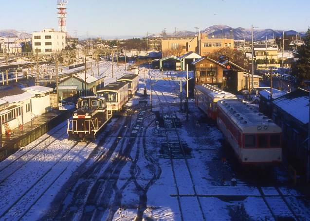 雪化粧した石岡機関区構内、貨物輸送健在のころの撮影でまだ機関車の姿も見えます。