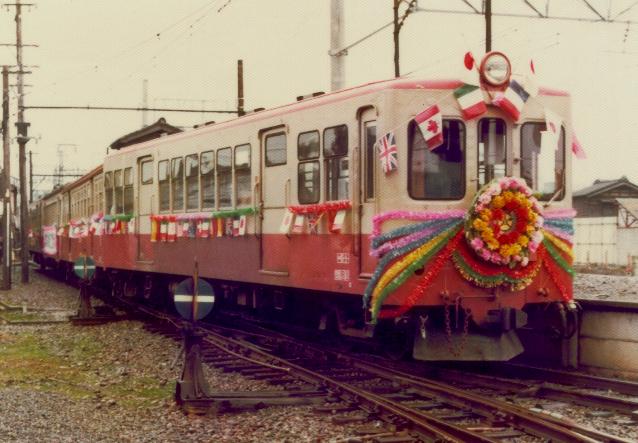 下長岡を発車する廃止記念花電車、栃尾線の電車はナローとはいえスマートで高性能な車両ばかりでしたが現在では保存車両さえ一両も残っていません。