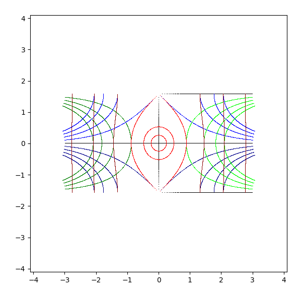 複素平面は横軸が実軸で、縦軸が虚軸となります。実軸と虚軸は黒 (black) で描画します。横線を青 (blue と darkblue) で、縦線を緑 (lime と green) で、原点を中心とした円を赤 (red と darkred) で描画しています。これを複素関数 sqrt, exp, log, sin, arcsin, cos, arccos, tan, arctan, sinh, arcsinh, cosh, arccosh, tanh, arctanh に渡して、評価結果を複素平面に描画します。