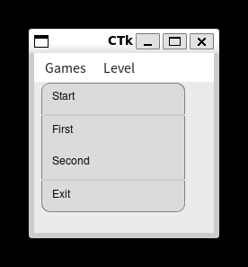 CustomDropdownMenu() でドロップダウンメニューを作り、それを games に結びつけます。あとは、add_option() で必要な項目を追加するだけです。これで Games をクリックすると、Start, First, Second, Exit という 4 つの項目が現れます。