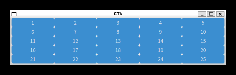 b = ctk.CTkButton(root, text = '{}'.format(y * 5 + x + 1), font = my_font)