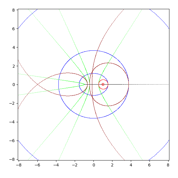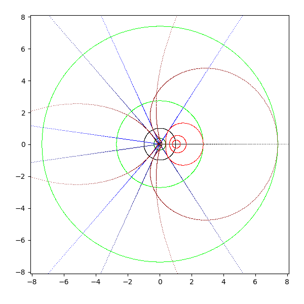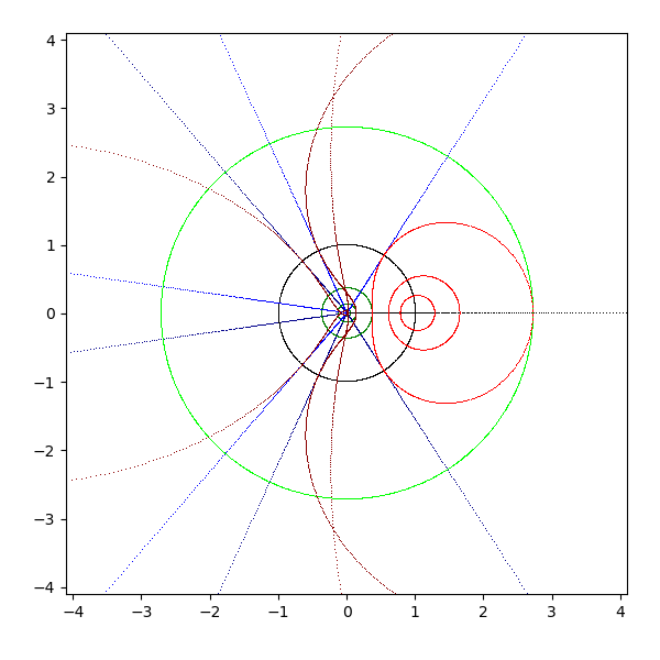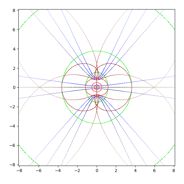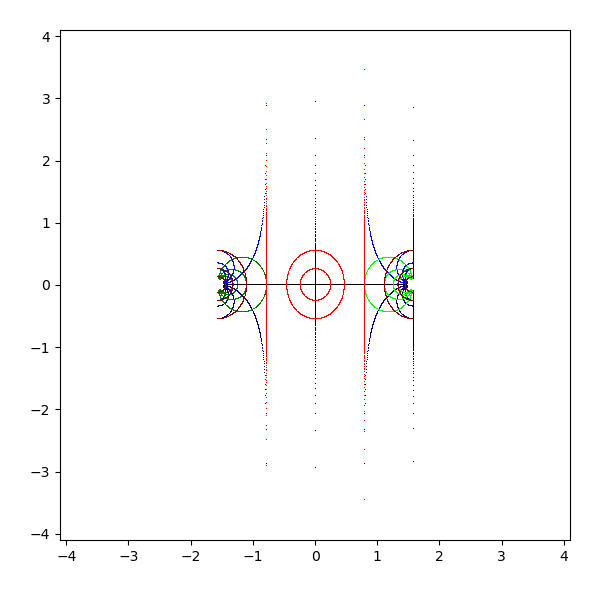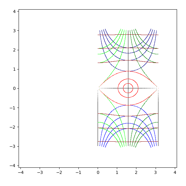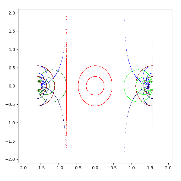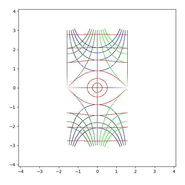 複素平面は横軸が実軸で、縦軸が虚軸となります。実軸と虚軸は黒 (black) で描画します。横線を青 (blue と darkblue) で、縦線を緑 (lime と green) で、原点を中心とした円を赤 (red と darkred) で描画しています。これを複素関数 sqrt, exp, log, sin, arcsin, cos, arccos, tan, arctan, sinh, arcsinh, cosh, arccosh, tanh, arctanh に渡して、評価結果を複素平面に描画します。