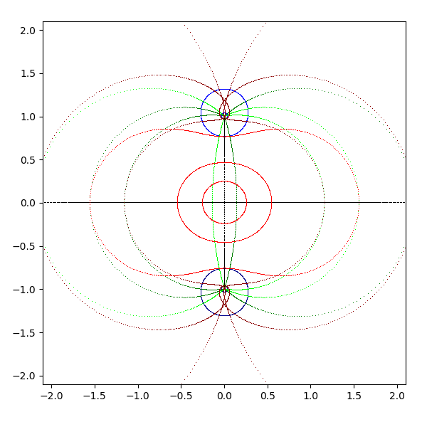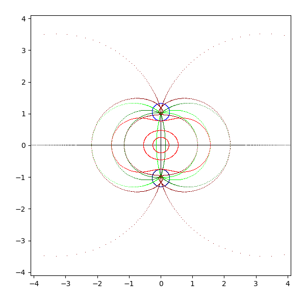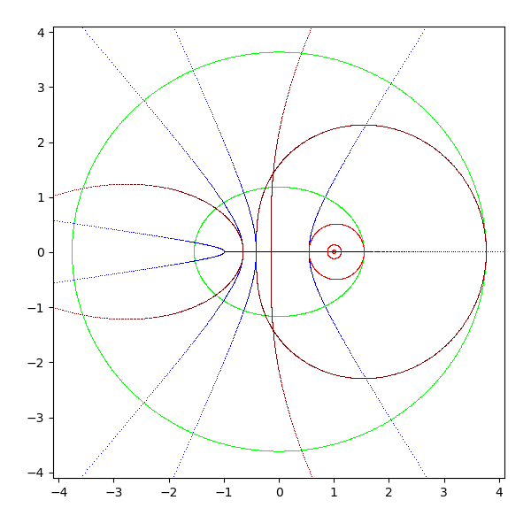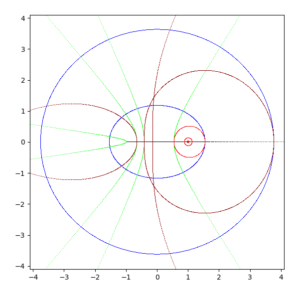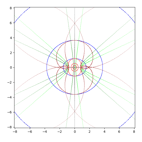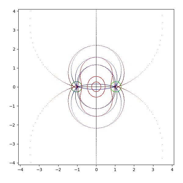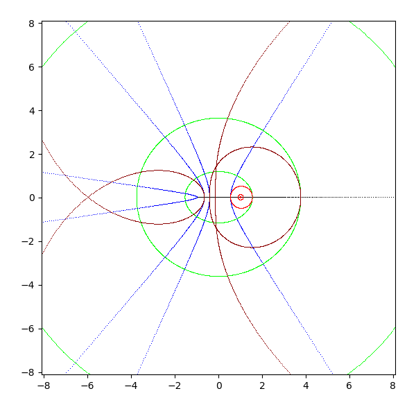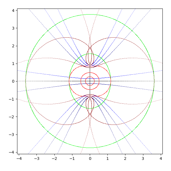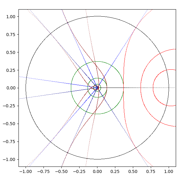 複素平面は横軸が実軸で、縦軸が虚軸となります。実軸と虚軸は黒 (black) で描画します。横線を青 (blue と darkblue) で、縦線を緑 (lime と green) で、原点を中心とした円を赤 (red と darkred) で描画しています。これを複素関数 sqrt, exp, log, sin, arcsin, cos, arccos, tan, arctan, sinh, arcsinh, cosh, arccosh, tanh, arctanh に渡して、評価結果を複素平面に描画します。