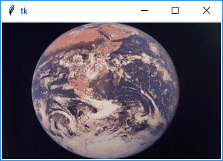 リスト:画像の表示 import tkinter as tk root = tk.Tk() image1 = tk.PhotoImage(file = 'earth.gif') tk.Label(root, image = image1).pack() root.mainloop()