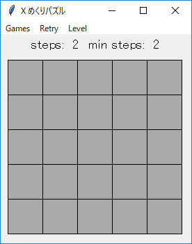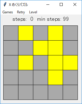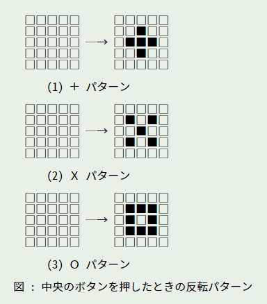 皆さんお馴染みのパズル「ライツアウト」や「8めくりパズル」と同様のパズルです。今回は 5 行 5 列盤で 3 つのパターンを用意しました。