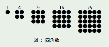 - 四角形に配置したものを四角数 (square number)