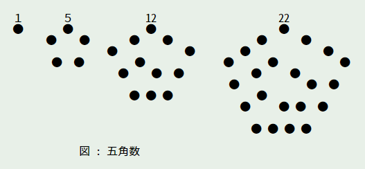- 五角形に配置したものを五角数 (pentagonal number)