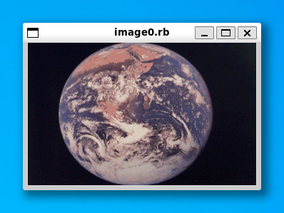 リスト : イメージの表示 require 'tk' c0 = TkCanvas.new(width: 400, height: 300) c0.pack() image_data = TkPhotoImage.new(file: 'earth.gif') TkcImage.new(c0, 200, 150, image: image_data) Tk.mainloop
