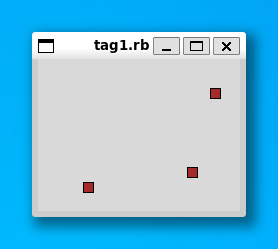図形には複数のタグを設定することができます。そして、図形を操作するメソッドは、操作対象となる図形の指定を、オブジェクトのほかにもタグを使って行うことができるのです。タグの設定は図形を生成するときにオプション tags で行います。それでは矩形にタグをセットして 3 つ作ります。