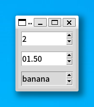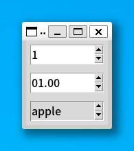 スピンボックスを 3 つ作ります。s1 は 1 から 10 までの数値で、increment は 1 です。s2 は 1 から 5 までの数値ですが、increment は 0.5 なので浮動小数点数で表示されます。format の指定が %05.2f なので、表示は 01.50 のようになります。s3 は apple, banana, cherry, grape, orange から選択します。state に readonly を指定したので、エントリーから入力することはできません。