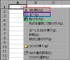 移動やコピーなどの操作の対象となるセルの上で右クリックをすると
