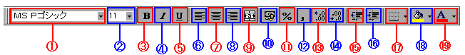 これが「書式設定ツールバー」です。セルに入力したデータの書式に対しての編集を行います。