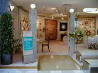 左の作品は新井野先生の結婚二十周年を記念したもので、子供が3才のころに描いた絵や、家を建てたことなど家族の思い出を縫いこんであります。 手前の作品は、ビクトリア調の華やかなイメージのクレージキルとです。 |