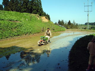平野部の田んぼと違い狭いもので、大型の機械が入らず小さな田植え機でせっせと頑張りました。