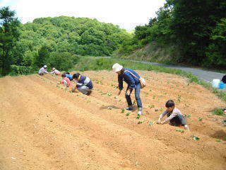 さつまいも苗植え 昨年のさつまいも収穫祭が、子供たちに大変好評だったため、今年は苗植えから参加しました。 天気にも恵まれ、新潟市から訪れていた家族連れと一緒に植えてまいりました。 今年も9月24日(日)のいも掘りに参加したいです。 皆さんも道院高原に行きませんか。 2002.6.2 |