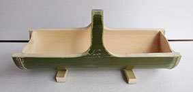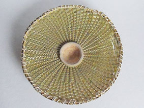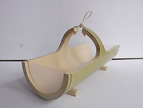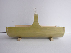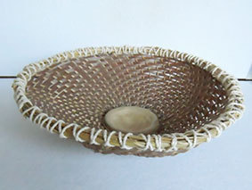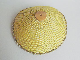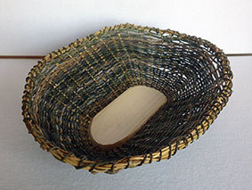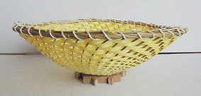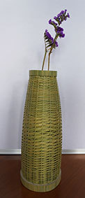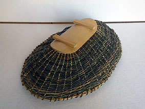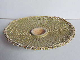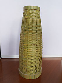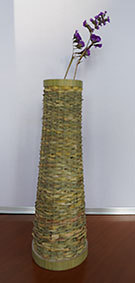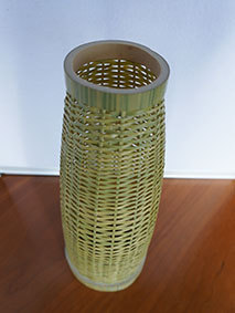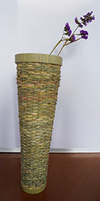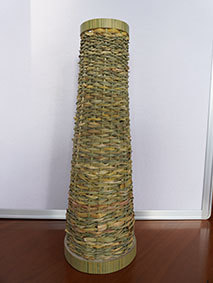 瓶などをカバーするものですが、これはやや大きく四合瓶が入るようにしています。竹ひごに巻いているのは藁です。出来上がってみると結構見栄えがしますが、制作途中は藁が切れてしまうことが多く、短気な私にとっては苦難の制作でした。なんか、3枚目のように逆にした方がいいような気がしています(この場合は瓶は入りません)。