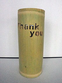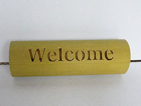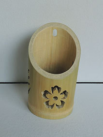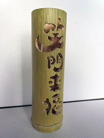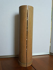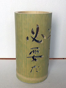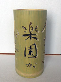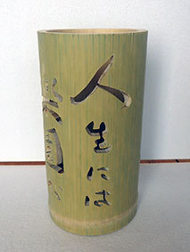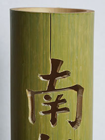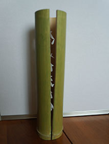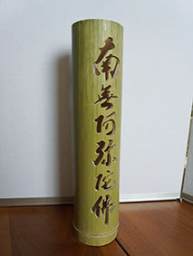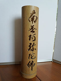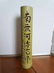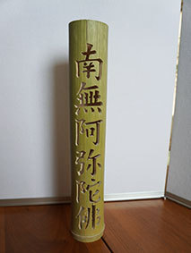 これも昨年暮れに伐採した若竹を利用しようということで、「南無阿弥陀佛」の文字を入れてみました。どうしても竹は乾燥の具合で割れてしまいます。これは、かなり乾燥させてから制作したのですが、若い竹で密度が粗いためか、あっさりと割れが出てしまいました。