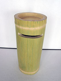 これも四合瓶対応のカバーで、竹の表皮を巻いています。これは、上に向かって少し膨らむように下穴の角度を調節してみました。私的にはこちらの方がいいですね。