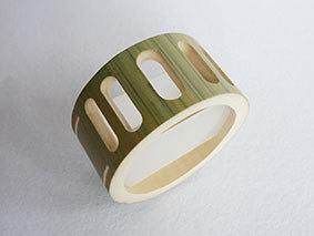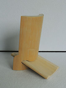 また書体の違うバージョンです。これには割れを防ぐため、後ろに切れ目を入れてみました。下は節があるのでそんなに開きませんが、上はかなり開いてしまいます。今のところ、文字の部分には割れは生じていません。