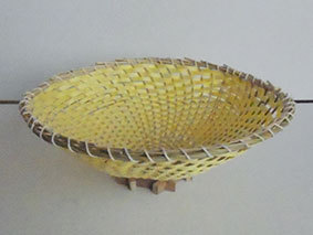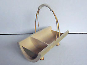 残り物の材料で作ってみました。小物入れに使えるでしょうか。足は篠竹の節の部分を使っています。取手は竹枝で、上の部分をタコ糸で巻きました。