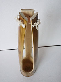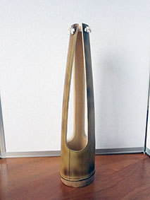 No.14で乾燥中と記載したものです。乾燥の具体がマズかったのか、取手の付け根あたりに少しヒビが入ってしまい注意して制作しましたが、結局折れてしまいました。接着剤で繋ごうかと思いましたが丁度いい具合の竹枝があったので差し込んで、両側にも飾りの切り込みを入れてみました。なお、表皮も手っ取り早く削りました。