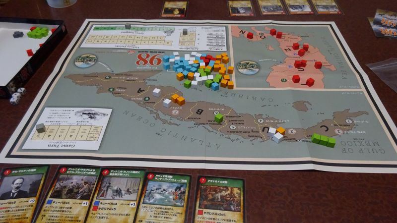 今度は陣営を入れ替えます。第1ターン、スペインはキューバに集中したものの、損害が大きい。第2ターン、アメリカは海戦に勝って増援が来たものの、損害が大きい。第3ターン、スペインは機雷爆発と裏切りのジャングルを引くという不運に見舞われるものの、前者で6を出して救われた。