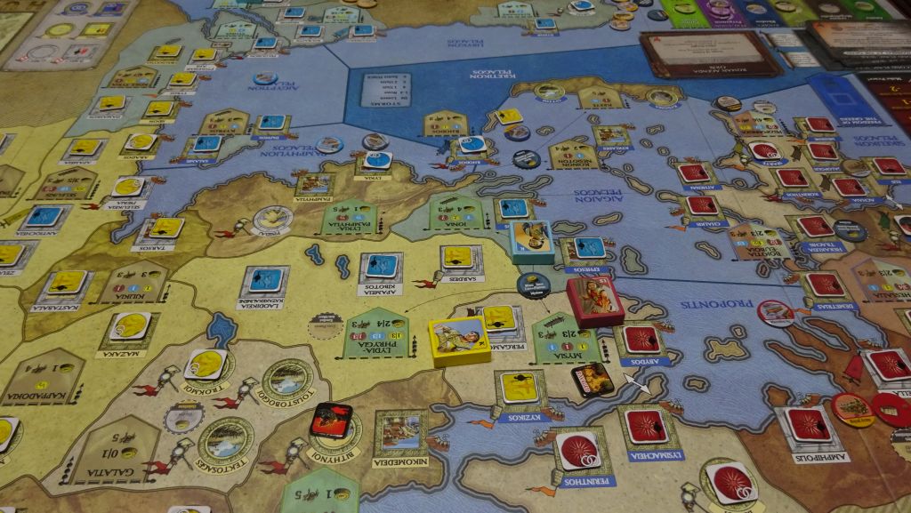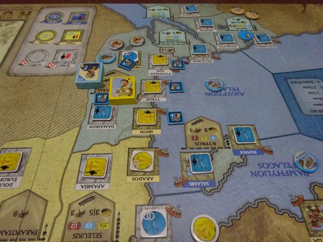 第3ターン、これまで大量の英文カードテキストを読むのにかなり時間が掛かったので、このターンを最終ターンにすることとしました。まず先手を取れたアンティオコス王が、リディア=フリュギアで残っていた堅城サルディスを落として名声を稼ぎました。プトレマイオス朝はサトラピーを支配していても、中立の場所を攻めるのは止められないのです。
