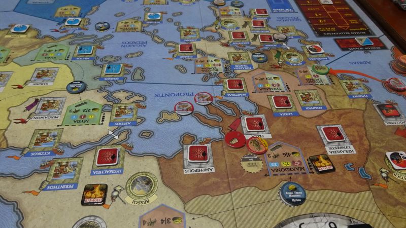 一方激戦地から遠いマケドニアのフィリップ5世は、エジプトから遠く離れたトラキアのプトレマイオス領を攻撃して2都市を奪い取りましたが、直後にイベントで片方を失ってしまいました。その後も繰り返し起きるギリシャの反乱に手を焼きながら、最後に追加1アクションできる冬季戦役能力で、なんとか支配を取り戻してターンを終えます。マケドニアは重税に耐えきれず荒廃しましたが。