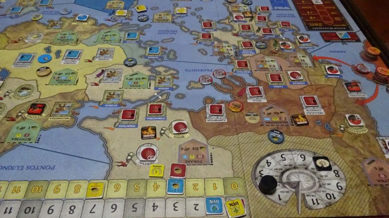 アンティゴノス朝は作戦が大成功し、トラキアやギリシャを完全に支配しました。セレウコス朝も外交が成功して、プトレマイオス朝が同盟していたエーゲ海の島国を奪取した上、北東の辺境バクトリアネも攻略してVPで猛追します。そしてプトレマイオス朝は、反乱が終わって空白になったリディア=フリュギアに攻め込み、ここの支配に成功しました。これにより三者が1VP差で並ぶ接戦となります。