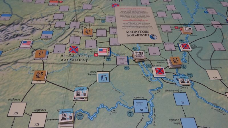 第2ターン、北軍の他のカードは1ばかりでしたが、1枚だけあったメジャーキャンペーンで、ハレックとロゼクランが6戦力を集めて2戦力のASジョンストンを撃破。ナッシュビルを陥落させました。一方南軍は2枚の増援カードを引き、戦力が充実してきます。そして最後のカードでブラッグがケンタッキーの背後に回り込み、ハレックらの補給を切ってきました。序盤から激しい攻防戦です。