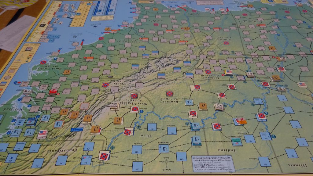 北軍は代わりにイベントを多用し、鉄甲艦除去、南軍損耗、上陸修正上昇、戦力増強と地固めに徹しました。その間に直接妨害を受けることの無かったリーは、ケンタッキーのルートを回復し、砦を築いてインディアナ侵攻を達成します。周囲に敵無しのリーは、次ターンどれだけ支配を広げられるか?ただリーの軍は小さな戦闘の繰り返しで、戦力が乏しくなっているのが難しい所。