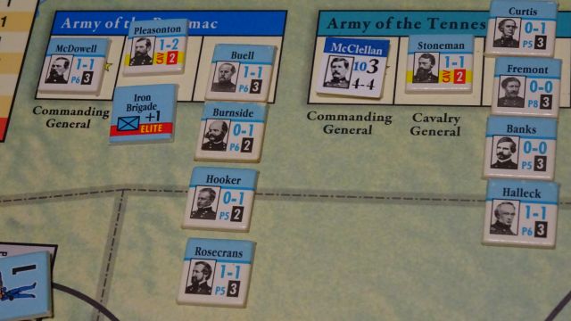 歴史的には北進を二度とも失敗したリーですが、その彼が2、3州を3ターンに渡って席巻し続けるのを、北軍が止められないなどという非現実的な事は、実際にリーを止めたマクレランが史実通り許さなくなりました。そしてゲーム的にも、以前はリーのせいで前半にできることがかなり限られていた北軍でしたが、マクレランなら止めてくれるという安心感から、幅広く積極的な行動を取れて、遥かに多彩で考えどころが多くおもしろいゲームになりました。そしてこれは同時に、ユニットとしては前半に登場していないグラントらが西部で進撃していた歴史を、再現できるようになったとも言えます。また最近は南軍が前半にサドンデスできるかどうかで、だいたい勝負が決まる感じになっていましたが、これで後半まで進みやすくなったのも良い所です。