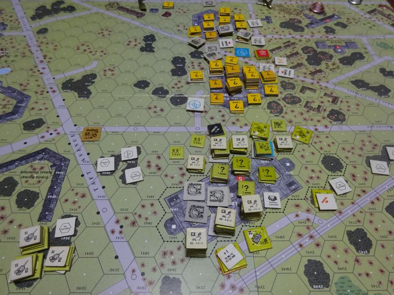 日本は155ミリ砲を避け、一番手前の建物を空けてきました。砲を有効に使えないアメリカは、せめて機関銃を統合して火力を上げないと、どうにもなりません。そこで第1ターン、西の機関銃はハーフトラックに載せて北の機関銃の所に持って行き、他の部隊は前進します。