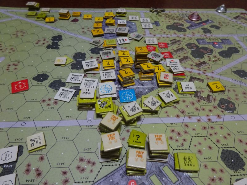 すると脇に鬼スタック隠匿されてました。機関銃6丁、素で36火力−2。散布射撃で歩兵2ヘクス壊滅、戦車2両がスタンとスタンリコール。うーん。