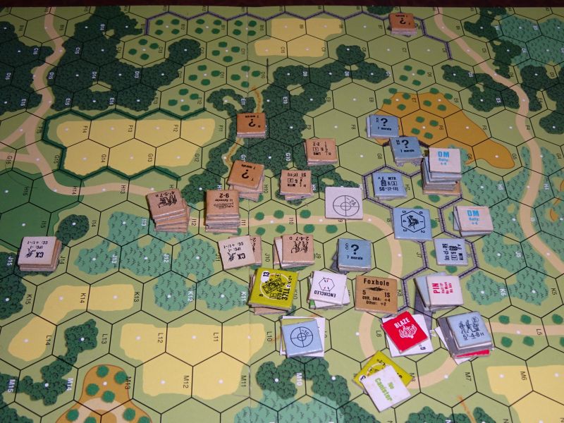 ドイツは守るならより固い石造建物付近だろうと、その付近に集まって、2つの建物を狐穴で繋ぐことにしました。そこへ突っ込んで来るM3たち。ドイツは待ち構えた対戦車砲で迎撃します。しかし12、故障。終わった。前面に出ていたドイツ機関銃スタックは戦車に包囲され、ターン後半にも対戦車砲は直らず、ドイツの防衛は崩壊して負けです。