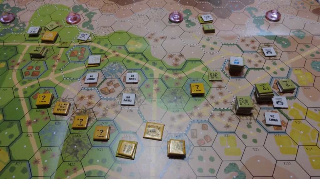 第5ターン、アメリカ軍は最後の建物に突入し、日本軍は不意を突いて逃げ出したものの、第6ターンには捕まり倒されます。日本は最後の奪還用に隠れていた部隊もありましたが、洞窟も入り口で待ち構えられ、村にも守備隊をばらまかれては、とても逆転できるほど奪還することはできません。アメリカの勝利です。