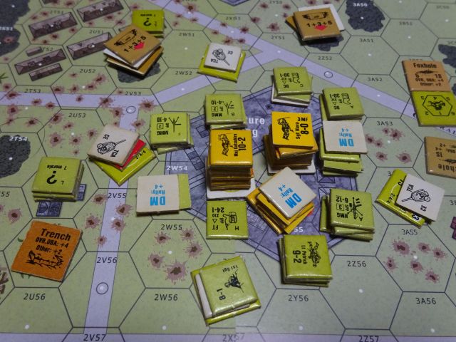 第2ターン、外殻にいた日本軍は隠匿も含めてどんどんやられます。やはり高火力は伊達じゃない。日本は完全に外殻を捨て、スタック制限に溢れた半個分隊だけを外に出し、残りはフルスタックで内部に隠れました。
