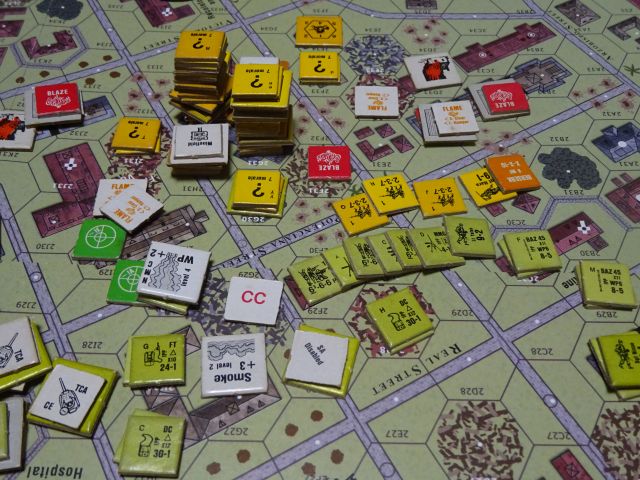 第2ターン、アメリカ軍は日本半個分隊を除去し、建物群に近付きます。すると日本は右側でも放火し、延焼も順調。ところが日本の放火スタックが、防御射撃で指揮官以下ばあさあく〜。