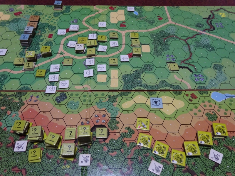 ドイツは村の中でできるだけ持ちこたえる手を色々考えますが、高火力相手に戦ってもただ一方的にやられるだけです。そこで初期配置のドイツ軍は村を捨て、全員森の中に隠れることにしました。