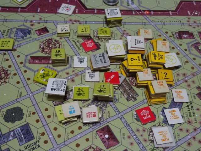第3ターン、アメリカ歩兵は瓦礫を伝って前面の木造建物に突入し、白兵戦は混戦。そして東からも歩兵スタックを伴った火炎放射器シャーマンと、脇に火炎放射器歩兵で状況の打開を試みる。