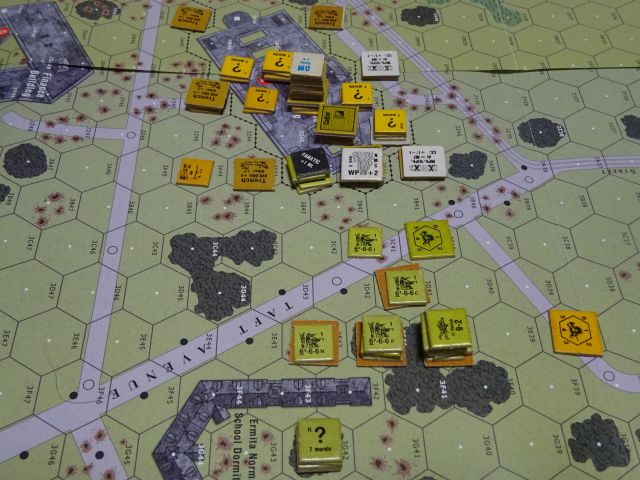 第3ターン、アメリカは外部の部隊が救援に向かいますが、正面は地雷、要塞、鉄条網で固められていて、側面も平地で攻めにくい。しかも建物は鉄柵で囲まれて侵入時+2MFなので、突撃で入るとCXになってしまいます。外部のアメリカ軍はひとまず建物に隣接したものの、その間に建物内の分隊は撃たれて混乱し、潰走時に地雷を踏んで除去されて、アメリカ軍は立法府から完全に排除されました。